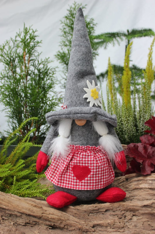 Wichtel - Madel - bayerisch - mit Schlenkerbeinen - Edelweiss - grau-rot - H 18 cm