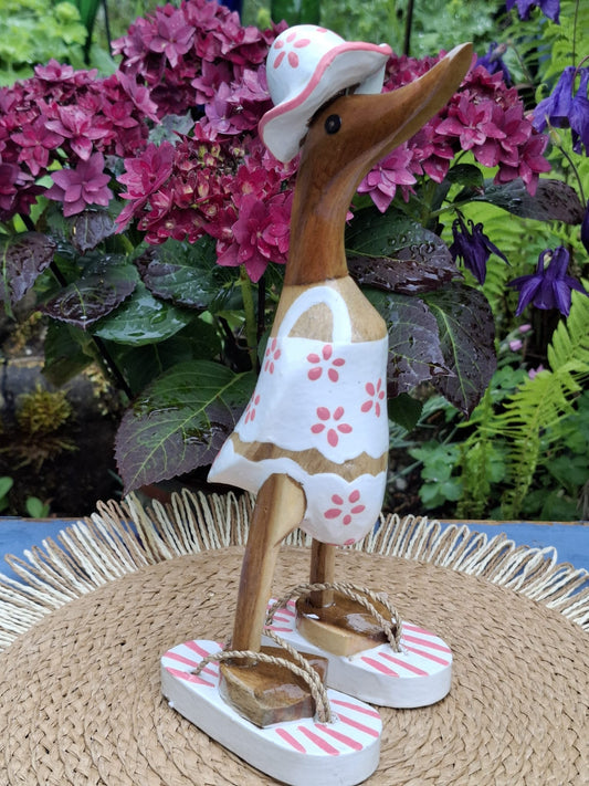 Bambusente im weißen Blümchen Kleid und Flip Flops ca 25 cm