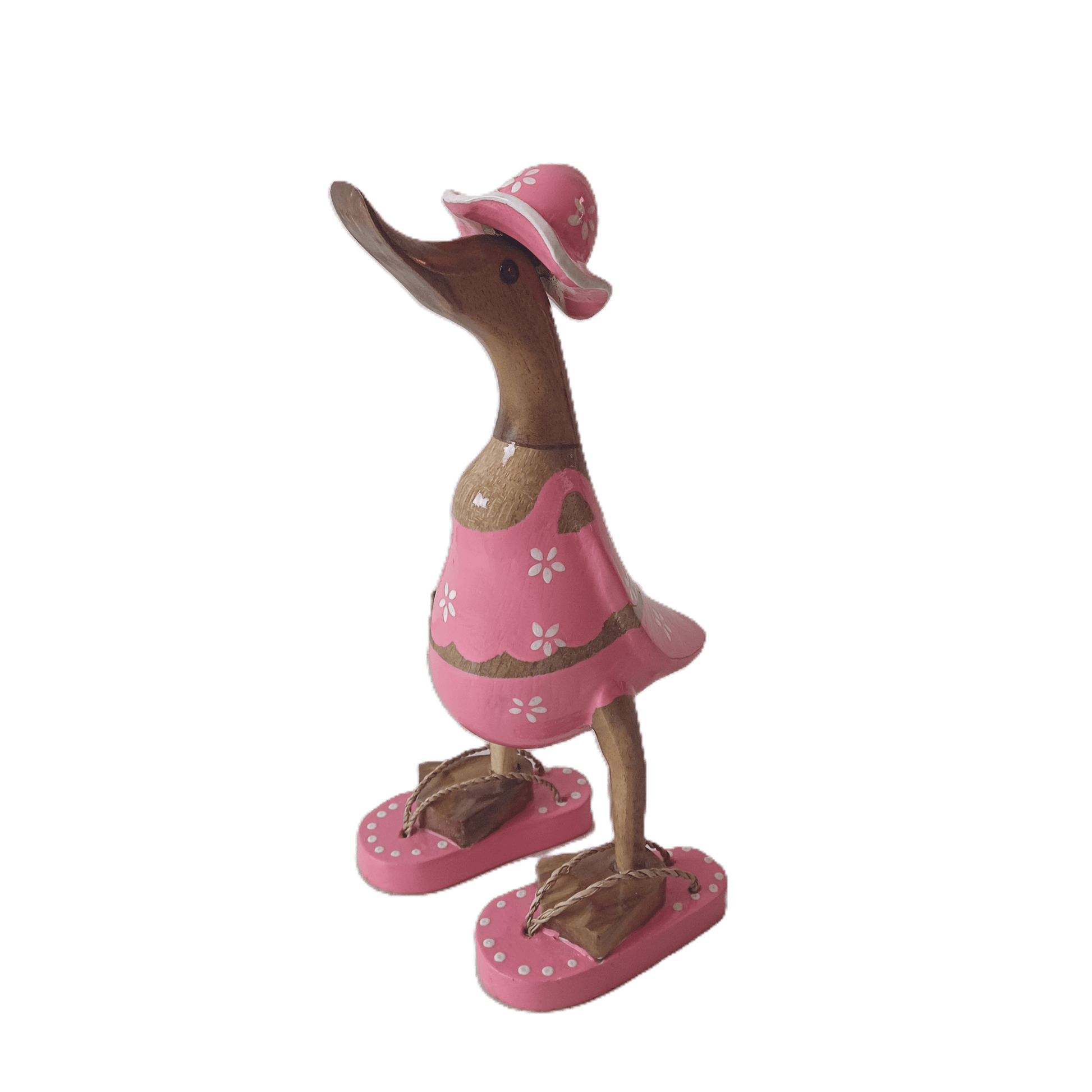 Ente aus Bambus im pinken Blümchen Kleid, mit Flip Flops und Sonnenhut - Höhe ca. 25 cm.