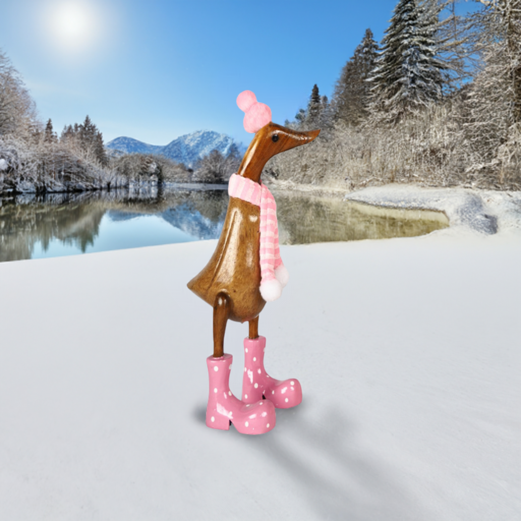 Ente mit Pudelmütze, Schal und Stiefeln aus Bambus in rosa ca. 40 cm