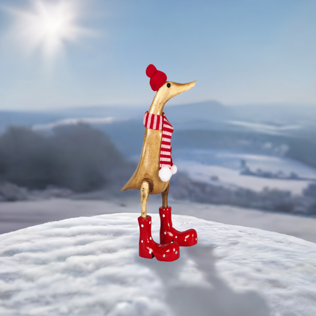 Ente mit Pudelmütze, Schal und Stiefeln aus Bambus in rot ca. 40 cm